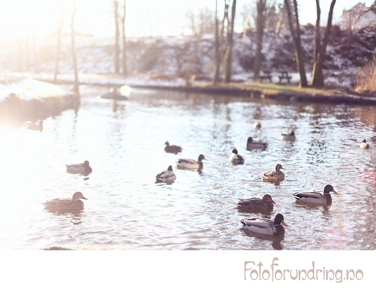 Og langs stien traff vi på en gjeng med ender som var så vakre i vinterlyset – (kanskje led de også av sollengsel).